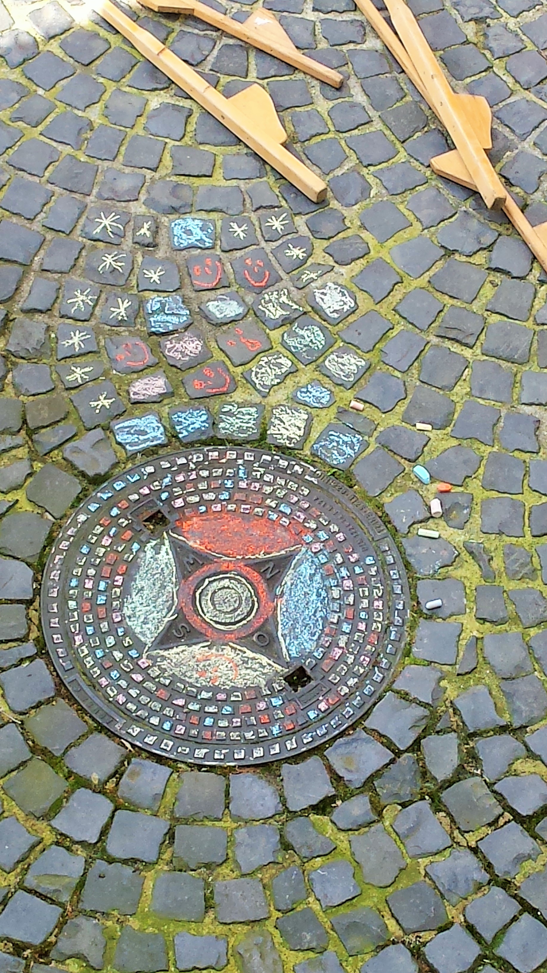 Tolle Idee: Kunst am Gullideckel! Bringt Farben in die Welt! Ich fand das so inspirierend, dass ich mir gleich ein paar Buntstifte und Spraydosen besorgt habe, mit denen ich heute unsere meist langweilig-farbunintensiven Wohnungseinrichtungsgegenstände verschönern werde. Meine Frau ist gerade in Urlaub, da hab‘ ich auch die nötige Muße dazu …