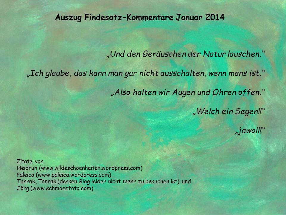 In dem zurückliegenden Jahr habt ihr mich immer wieder überrascht, zu welchen Gedanken euch der gesammelte Findesatz eingeladen hat. Eure Kommentare bereichern diese Sammlung und oftmals habe ich gedacht, eure wunderbaren Sätze verdienen ebenfalls eine kleine Bühne.