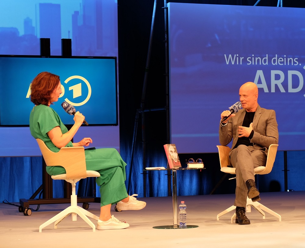 Hier seht ihr den Moderator Thomas Ranft im Gespräch mit dem Autor Bas Kast. Sein neues Buch trägt den Titel „Das Buch eines Sommers – Werde, der du bist“. Er nennt sein Buch ein Wohlfühlbuch. Die Hauptperson im Buch versucht, sich selbst zu finden. Im Gespräch ging es u.a. darum, wie wir unsere Zeit gestalten. Bas Kast meinte, dass der Blick auf die Endlichkeit unseres Lebens, dem Leben mehr Tiefe geben könne. Wenn er zum Beispiel wüsste, dass er nächste Woche sterben würde, würde er, anstelle sich die Zeit mit seinem Handy zu vertreiben, mehr raus in die Natur gehen oder gute Gespräche mit seiner Frau führen.