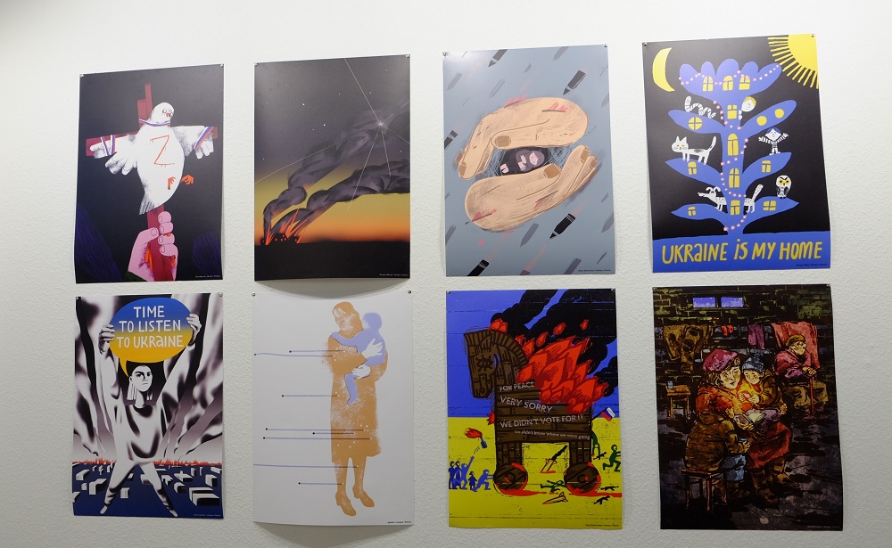 Bilder von ukrainischen Künstlerinnen und Künstlern sind zu sehen, die sich mit dem Thema Krieg beschäftigten und ebenso mit der ukrainischen Kultur: