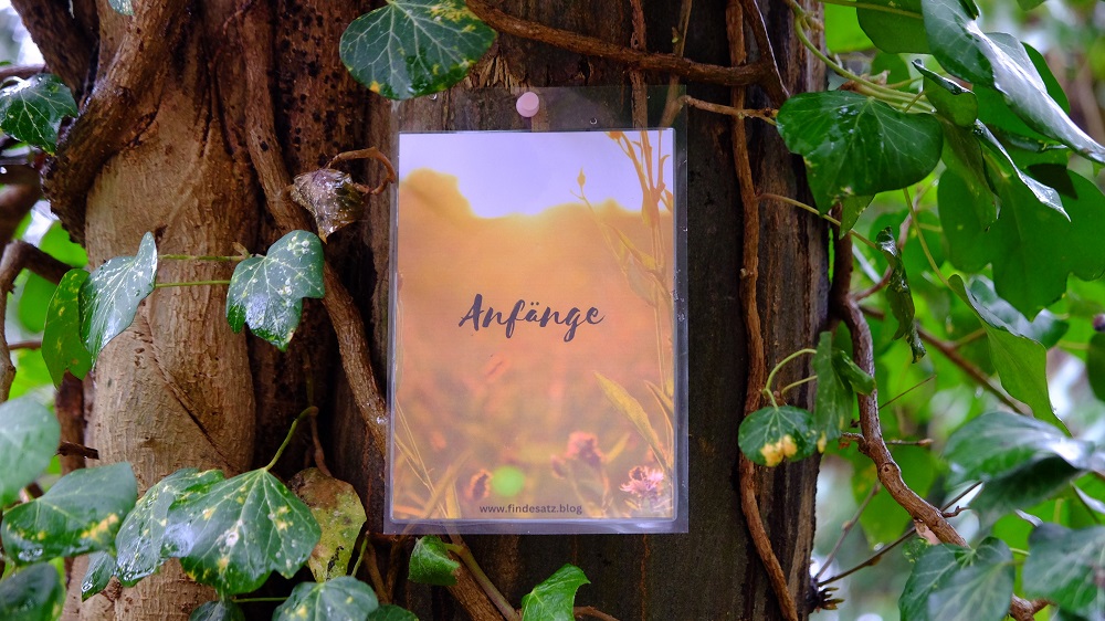 Dieses Jahr findet ihr hier zwei Kategorien. Kategorie 1: Findesatz und Wortspiel. Wöchentlich teile ich einen Satz, der mich durch seine Poesie, Tiefe oder Skurrilität inspiriert hat. Daraus entsteht ein Gedicht oder eine Kurzgeschichte, ergänzt durch ein passendes Foto. Kategorie 2: Verstecktes Wort der Woche. Ich wähle jede Woche ein Wort, das mit dem nächsten Buchstaben des Alphabets beginnt, schreibe es auf und verstecke es an öffentlichen Orten. Fotos zeigen das Wort und seinen Versteckplatz. Wie jedes Jahr werde ich über die Leipziger Buchmesse und die Frankfurter Buchmesse berichten.