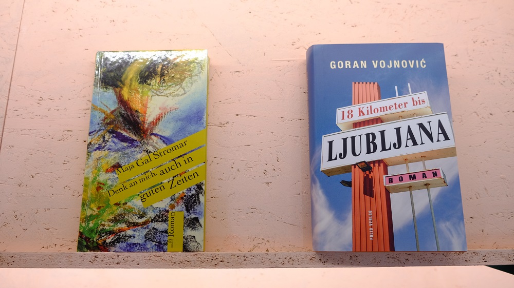 Der Weg durch den offenen Teil des Pavillons wird von sogenannten „Wald“-Bücherregalen geschmückt. Ich entdeckte bereits gute Werke slowenischer Autoren und Autorinnen: