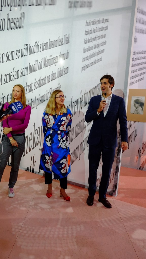 Hier seht ihr ihn, daneben seine Frau Urška Sadar, die slowenische Designerin und Gründung von urskas, einem Designstudio und einer Schmuckmarke. Sie ist Mitgestalterin des Ehrengast-Pavillons. Und links daneben Katja Stergar, die Direktorin der Slowenischen Buchagentur: