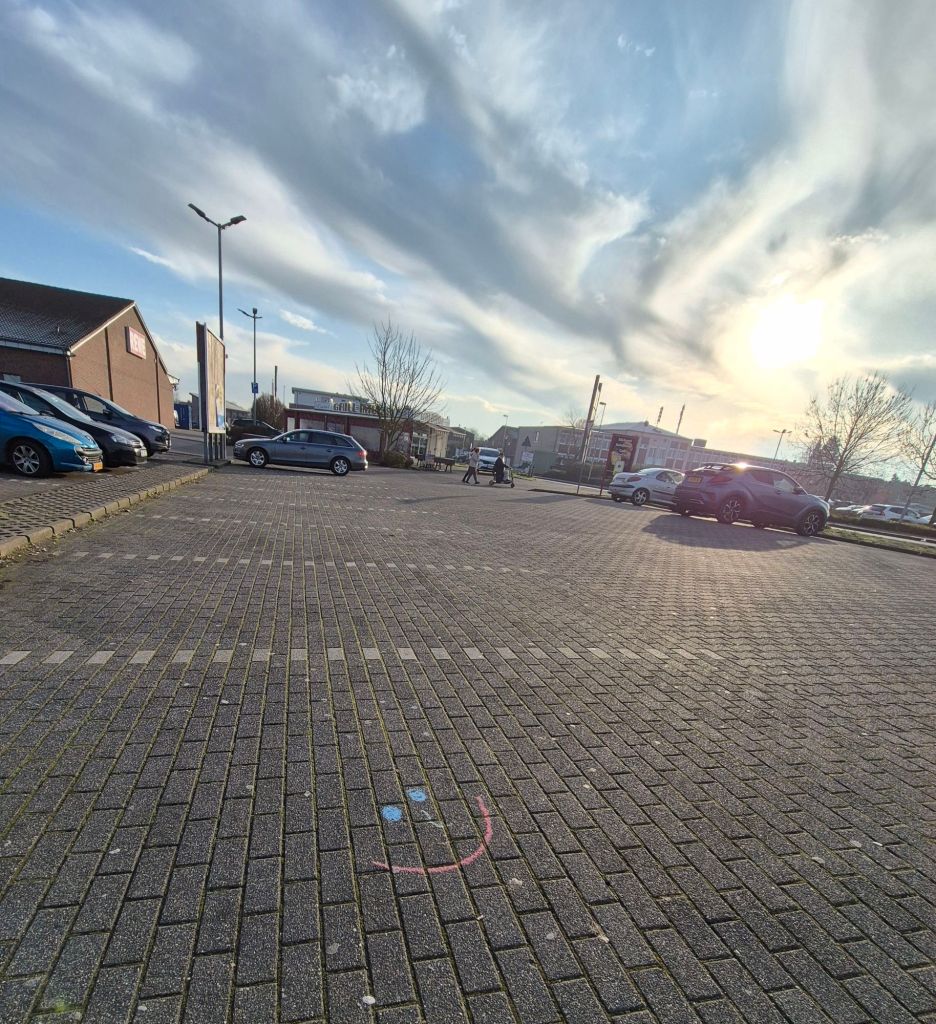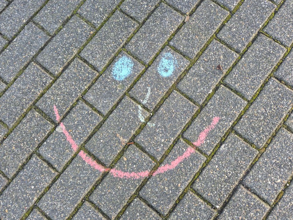 Kategorie 2 – Lächelspuren: Ebenfalls wöchentlich hinterlasse ich lachende Gesichter aus Naturmaterialien oder Kreide im öffentlichen Raum, und halte es mit einem Foto fest.