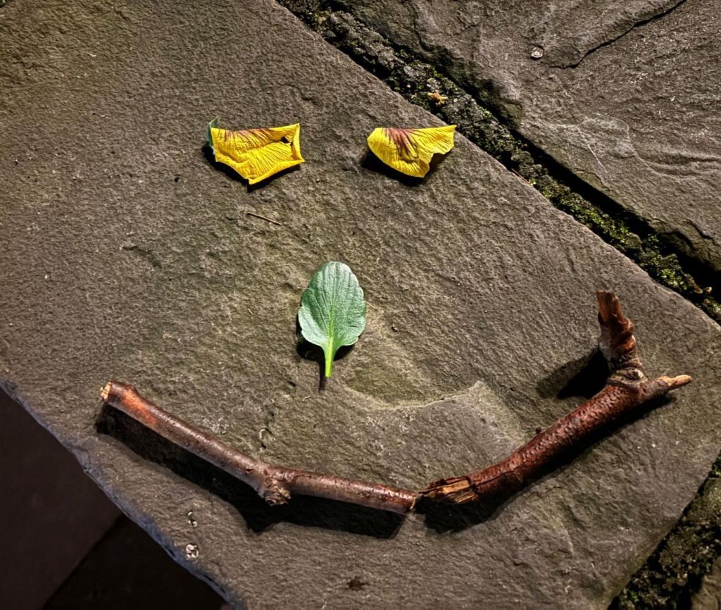 Kategorie 2 – Lächelspuren: Ebenfalls wöchentlich hinterlasse ich lachende Gesichter aus Naturmaterialien oder Kreide im öffentlichen Raum, und halte es mit einem Foto fest.