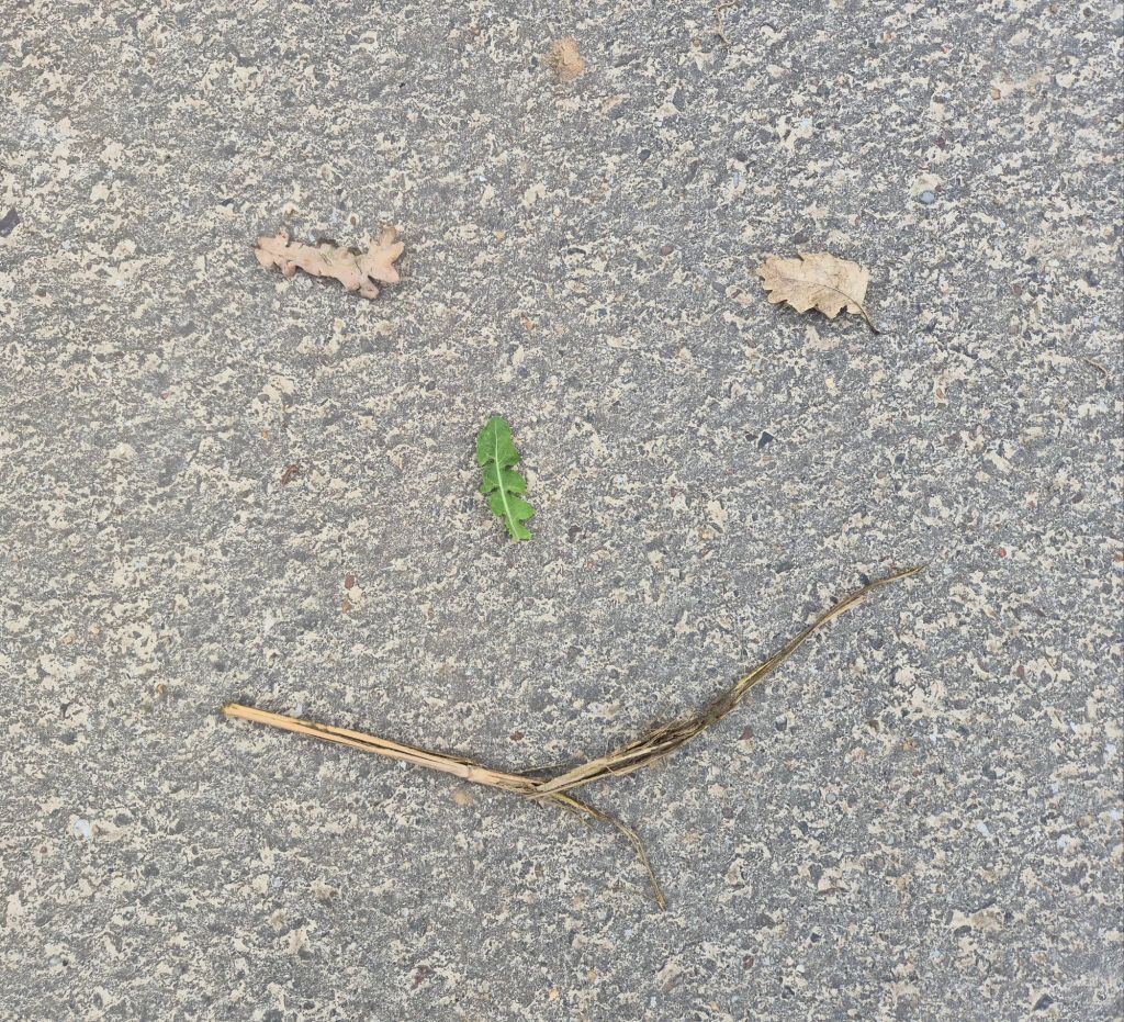 Kategorie 2 – Lächelspuren: Ebenfalls wöchentlich hinterlasse ich lachende Gesichter aus Naturmaterialien oder Kreide im öffentlichen Raum, und halte es mit einem Foto fest.