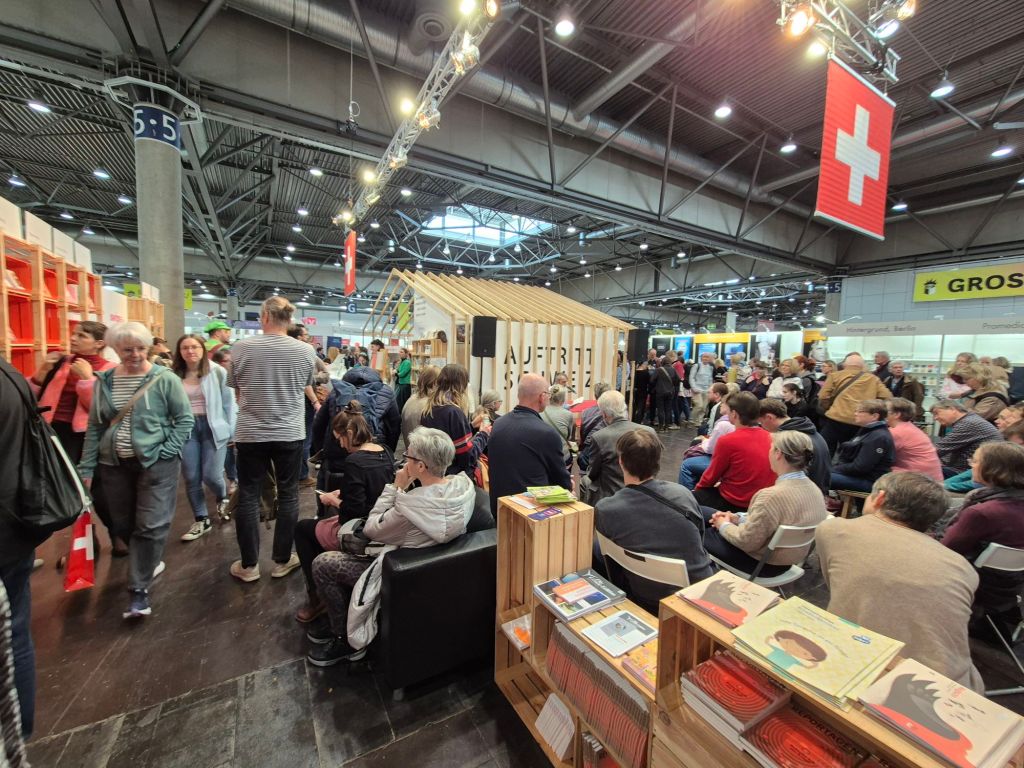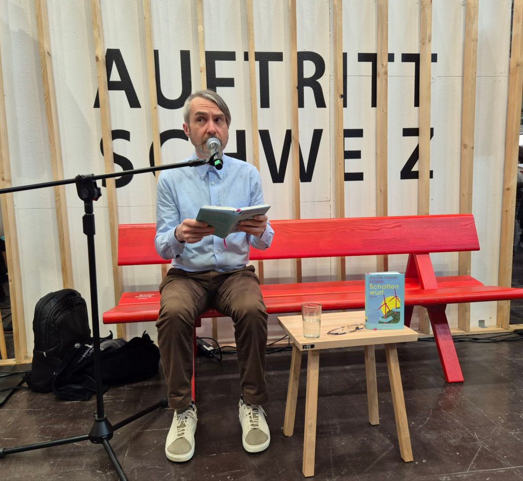 Am Schweizer Stand erlebte ich Walter Fabian Schmid mit seinem Roman „Schattenwurf“, in dem es um Energiekrise, Klimaschäden, Fake News und Wutbürger inmitten einer dörflichen Idylle geht:
