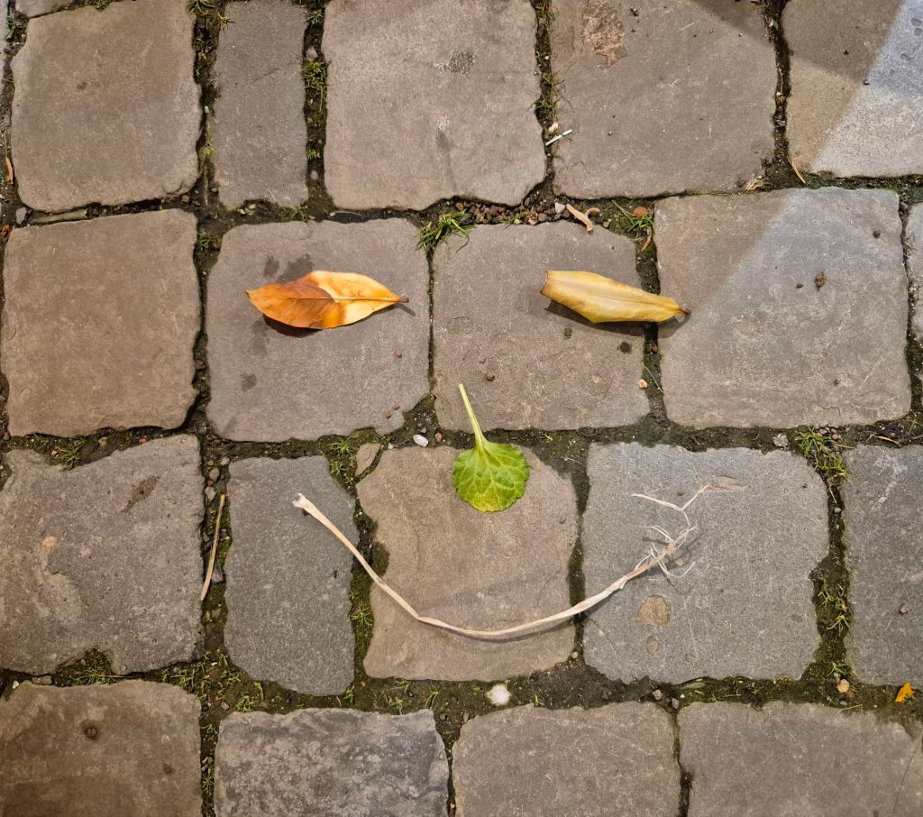 Kategorie 2 – Lächelspuren: Ebenfalls wöchentlich hinterlasse ich lachende Gesichter aus Naturmaterialien oder Kreide im öffentlichen Raum, und halte es mit einem Foto fest.