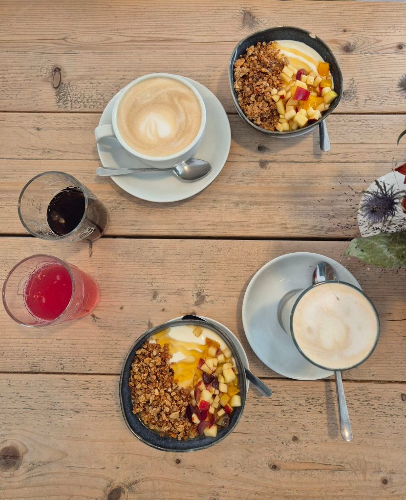 Nachdem sie diese Speisekarte gelesen hatten, bestellten sie einen Latte Macchiato, einen Cappuccino und zwei Frühstücksbowls.