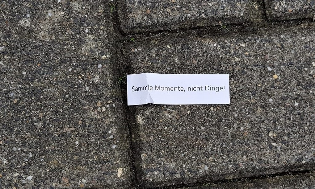 Ein weiteres Element meines Jahresprojekts ist das „Versteckte Wort der Woche“. Dabei wähle ich wöchentlich ein Wort, das mit dem nächsten Buchstaben des Alphabets beginnt. Dieses Wort schreibe ich auf einen Zettel und platziere es an einem Ort, an dem Menschen es entdecken können – etwa auf einer Parkbank, an einer Bushaltestelle oder in einem Wald. Ich freue mich, wenn das Wort jemanden anspricht und es mitgenommen wird.