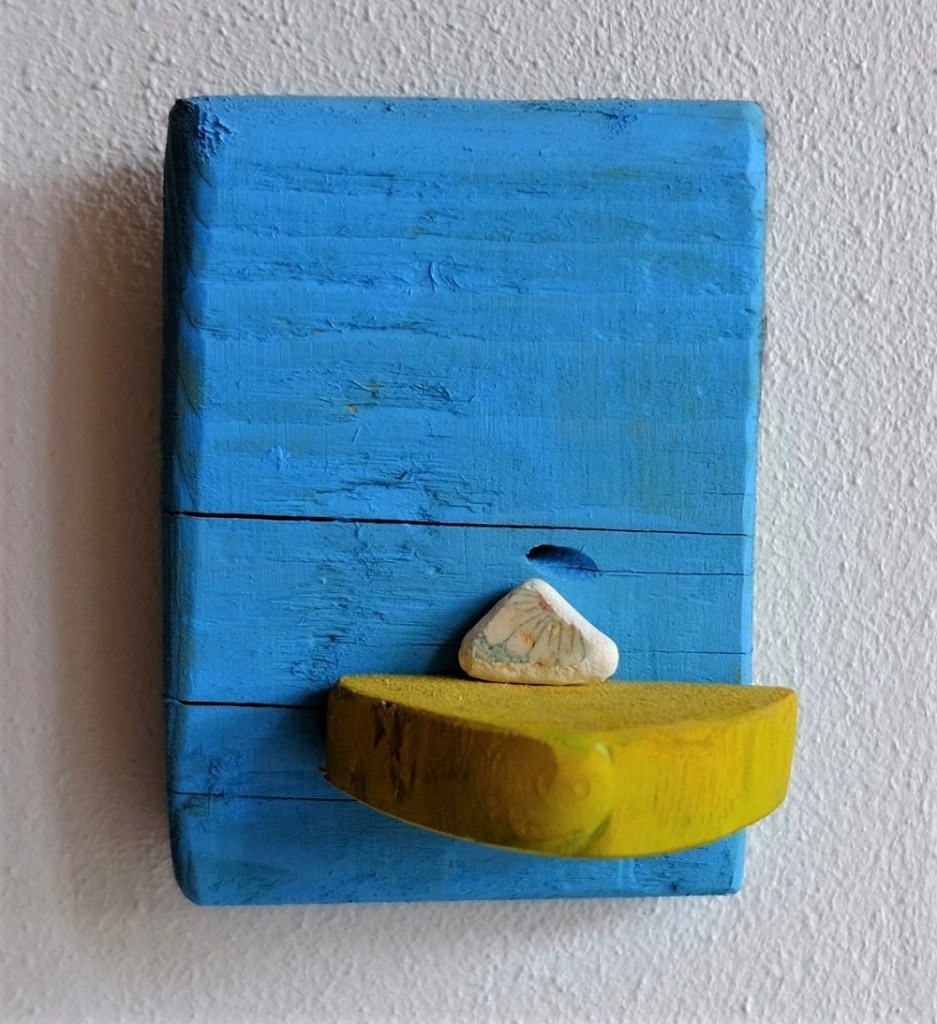 Hallo, ich möchte mich gerne vorstellen. Ich bin das Andenken. So heiße ich. Ich weiß, viele tragen meine Namen, doch das macht nichts. Wir sind dennoch alle einzigartig. Schön, dass du mir zuhörst. Ich möchte dir ein wenig von mir erzählen. Ich hänge an einer weißen Wand in einem Flur, in dem oft die Sonne hereinscheint. Fenster von oben und von der Seite lassen wärmendes Licht herein. Hier hänge ich gerne und zeige mich. Das ist eine schöne Mischung, abhängen, beobachten, sich präsentieren und Freude verschenken. So mag ich mein Leben. Ich sehe die Menschen, die hier wohnen, täglich gehen sie ein und aus. Ich sehe außerdem eine Katze, die hier lebt und dann sehe ich noch andere Menschen, die hier zu Besuch kommen. Ich glaube, es sind Freunde derer, die hier leben. In letzter Zeit sah ich sie weniger, doch sie werden eines Tages wieder häufiger kommen, da bin ich mir sicher. Ich hing nicht immer hier. Mein erster Wohnort trägt den Namen Veli Losinj, das ist ein bunter Ort auf einer kleinen kroatischen Insel. Dort lebte ich in einem wunderschönen Atelier, das lichtdurchflutet und in seiner Einfachheit bezaubernd war. Eine Frau namens Nena hat mich erschaffen. Sie ist eine Künstlerin. Sie war es auch, die mir meine Farben schenkte. Du musst wissen, ich bin entstanden aus Treibgut. Einst war ich Holz, das im Meer umhertrieb. Die Wellen kamen und gingen und eines Tages trieben sie mich an Land. An einem milden Frühsommertag kam diese Frau den Strand entlang, sie sammelte Sachen, aus denen ich bestehe. Sie hob mich auf, betrachtete mich und legte mich in einen mitgebrachten Korb. So lernte ich ihr Atelier kennen. Viele schöne bunte Gegenstände hingen an ihren Wänden. Erst lag ich auf einer ausgebreiteten Decke auf dem Innenhof und die Maisonne trocknete mich. Als ich trocken war, kitzelte Nena mich mit ihrem Pinsel. Sie malte mich an. Blau und Gelb stehen mir, wie ich finde. Später setzte Nena mich zusammen und dann durfte ich dort hängen, wo die anderen Kunstwerke hingen. Denn das war ich nun, ein kleines Kunstwerk. So nannte Nena mich und die bewundernden Blicke der Besucherinnen und Besucher schienen dem Recht zu geben. Es war eine schöne Zeit. Ich hörte Stimmen in vielen Sprachen. Kinderaugen bestaunten mich und die Augen der Erwachsenen wurden weicher, wenn sie mich ansahen. Nena pflegte uns gut. Eines Tages kam die Frau, in deren Haus ich nun lebe, in das Atelier. Sie kam mit ihrer Familie und auch sie gingen umher und betrachteten uns. Sie kamen mit Nena ins Gespräch und Nena erzählte von ihren Spaziergängen am Meer, bei denen sie das Treibgut sammelt. Bei mir blieben sie besonders lange stehen. Sie lächelten, als sie mich sahen. Sie wollten mir ein neues Zuhause schenken. So landete ich, in weiches Papier gehüllt, in dem Rucksack der Frau. Drei Wochen lag ich einpackt in einem Fach in einem rollenden Haus. Es war zwar ein wenig dunkel, doch gemütlich. Ich konnte die neuen Menschen mehr und mehr kennen lernen, indem ich sie zwar nicht sehen konnte, doch ich hörte sie durch den Schrank hindurch. Irgendwann nach vielem Geschaukel, das mich ein wenig an meine Zeit im Meer denken ließ, kamen wir in dem Ort an, an dem ich nun lebe. Ich wurde in das Haus getragen, das nun mein Zuhause ist. „Unser Andenken“, sagte die Frau, als sie mich auspackte. Da wusste ich, dass ich ein richtiges Andenken bin. Das Wort mag ich, es trägt schöne Erinnerungen und einen Hauch Achtsamkeit. Andenken bin ich gerne. Bedeutet es doch, dass in mir Geschichten wohnen und ich wortlos an Erlebnisse erinnern kann. Das ist mein Zauber. Nachdem ich an diese weiße Wand befestigt wurde, nahm die Frau den kleinen Stein und setzte ihn zu mir. Da fühlte ich mich so richtig vollkommen. Nachts, als die Familie schlief, fragte ich den kleinen Stein, wo er herkomme. Stell dir vor, auch er kam auch von dieser kleinen kroatischen Insel. Die Frau hatte ihn beim Spazieren am Strand entdeckt, dabei ist er so klein, dass er schon befürchtet hatte, er werde übersehen. Nun ist er immer bei mir und ich finde, wir passen wunderbar zusammen. Der Stein erinnert die Menschen an die Sonne, an das blaue Meer, an die Schönheit und Leichtigkeit der Insel, an Tage im Freien, an Luft, die in den Himmel malt. Ich bin gerne ein Andenken. Ich glaube, die Menschen mögen mich, da ich sie daran erinnere, dass aus dem Wenigen etwas entstehen kann, dass ein Hinsehen lohnt und dass ein Hauch der Insel mitgetragen werden kann an jeden Ort der Welt. Wenn sie mich betrachten sind sie manchmal für einen Moment still. Dann ist mir, als hören wir den Klang der Wellen, die sagen, alles kommt, alles geht, alles kommt. Das sagen sie mit einer solchen Zuversicht, dass ich mein Gelb und Blau lächeln lasse.