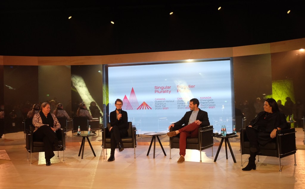 Nach dieser Eröffnungspressekonferenz ging es zum Ehrengast-Pavillon, wo ein Presserundgang stattfand. Kanada ist in diesem Jahr das Gastland der Buchmesse und steht damit im besonderen Fokus. Traditionell bekommt jedes Ehrengastland der Frankfurter Buchmesse einen großen Raum auf dem Messegelände – den Ehrengast-Pavillon, den es mit eigenen Ideen und Botschaften füllt. Gespannt betrat ich mit den anderen Medienvertrer*innen den Raum, der zunächst abgedunkelt war.